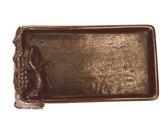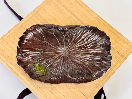 Y4970 TRAY wood carving lotus frog small OBON OZEN signed Japan antique vintage