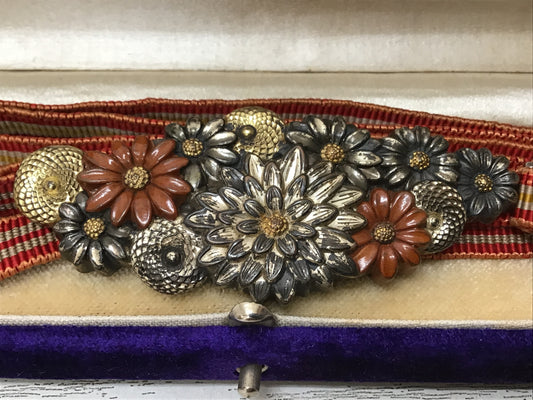 Y2296 OBIDOME Metalwork Sash Clip brooch Flower signed box Japan Kimono antique