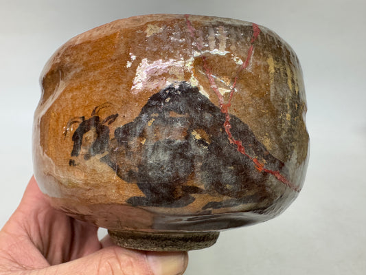 Y8583 CHAWAN Raku-ware red bowl kintsugi signed box Japan antique tea ceremony