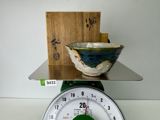 Y9432 CHAWAN Oribe-ware bowl signed box Japan antique tea ceremony teacup cup