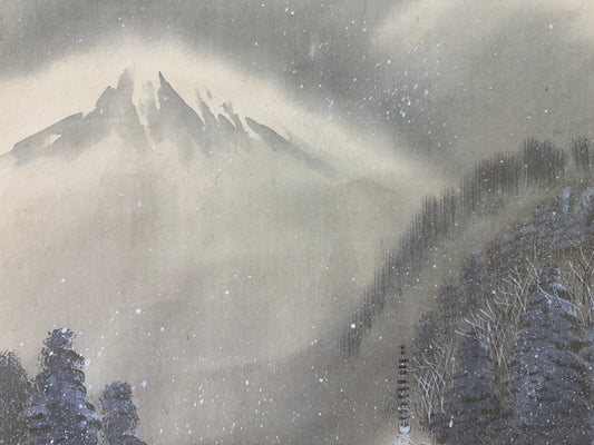 Y9589 KAKEJIKU Snow scene 5-storied Pagoda signed Japan antique hanging scroll