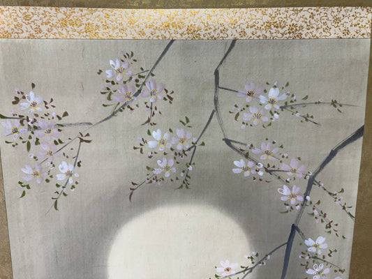 Y9590 KAKEJIKU Cherry blossoms Night Moon viewing signed Japan antique interior