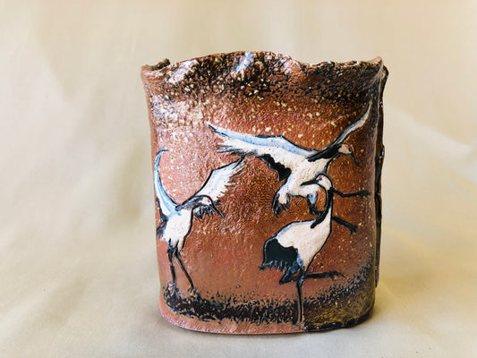 Y4343 FLOWER VASE Seto-ware crane signed box Japan ikebana antique interior