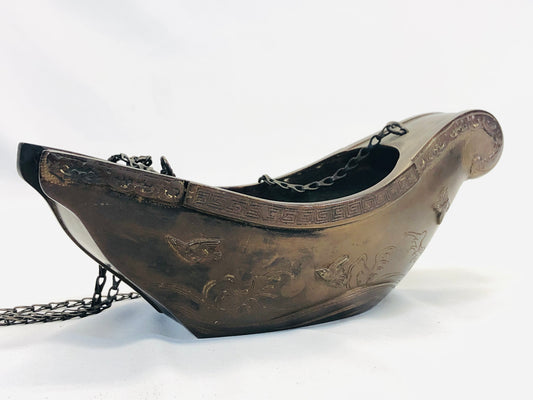 Y5209 FLOWER VASE Copper boat-shaped hanging wave plover Japan ikebana antique