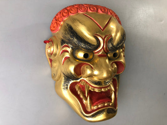 Y7373 NOH MASK wood carving Thunder bag signed Japan antique traditional omen
