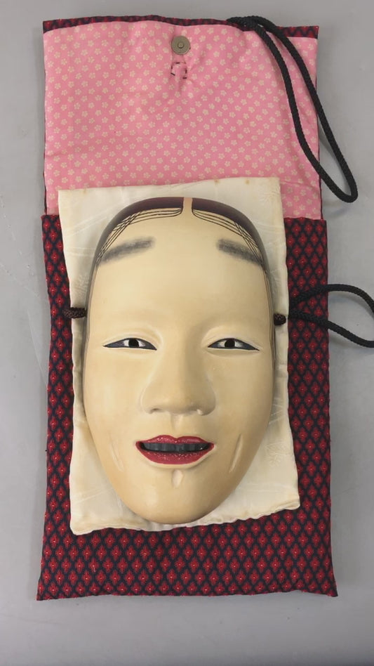 Y7383 NOH MASK wood carving Koshishi signed bag Japan antique traditional omen