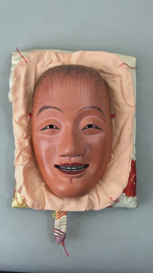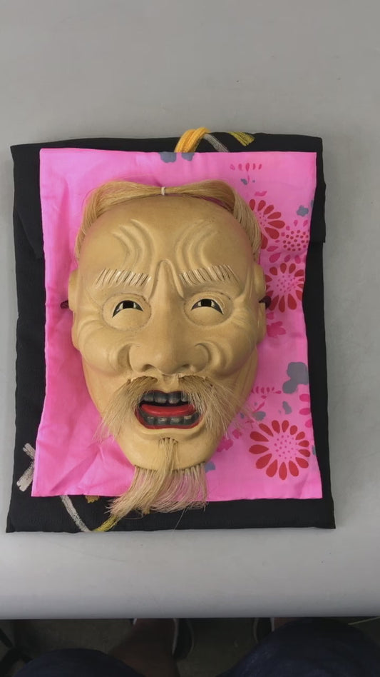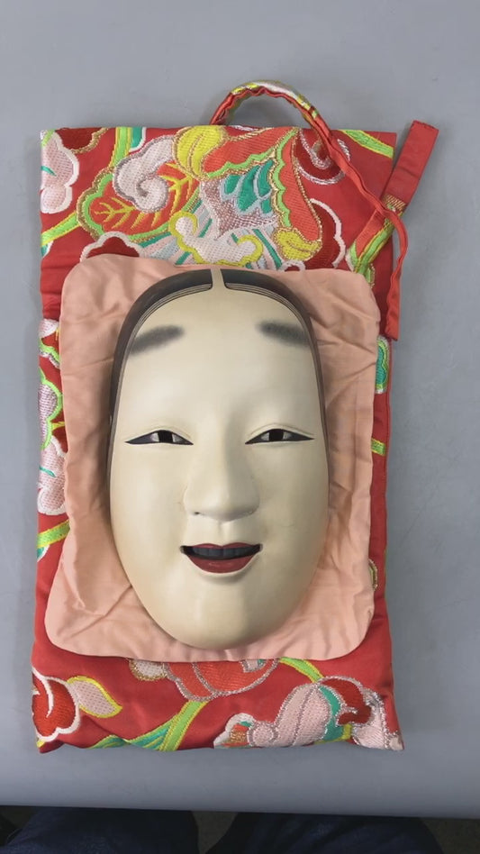 Y7393 NOH MASK wood carving signed bag Japan antique traditional men dance drama