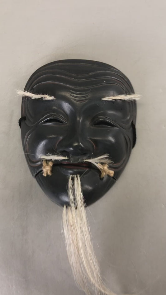 Y5976 NOH MASK wood carving signed black mustache Japan antique omen dance drama