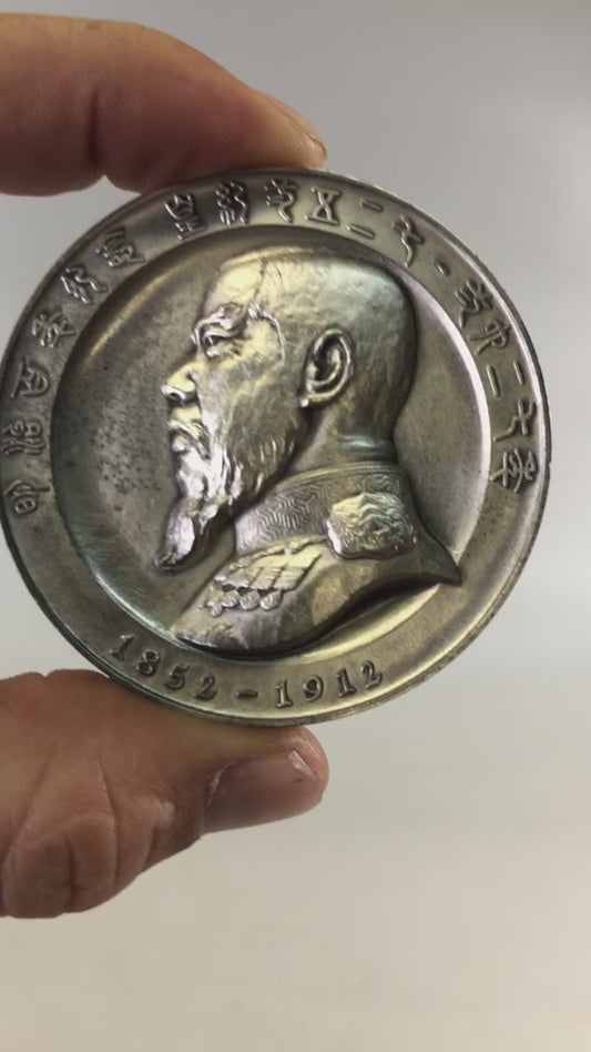 Y6542 [VIDEO] KUNSHO Sterling silver medal Emperor Meiji portrait box Japan antique