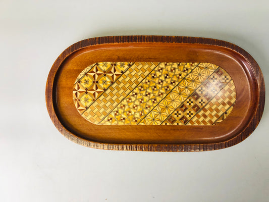 Y7289 TRAY Hakone woodwork Marquetry oval shape Japan antique wooden tableware