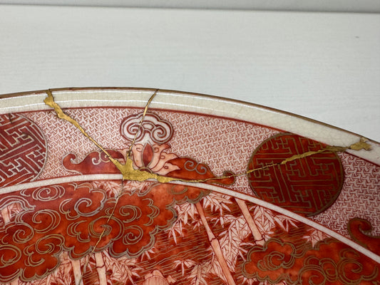 Y9818 DISH Kutani-ware Platter large plate red picture kintsugi Japan antique