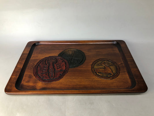 Y8465 TRAY wooden OBON OZEN ancient pattern carving box Japan antique kitchen