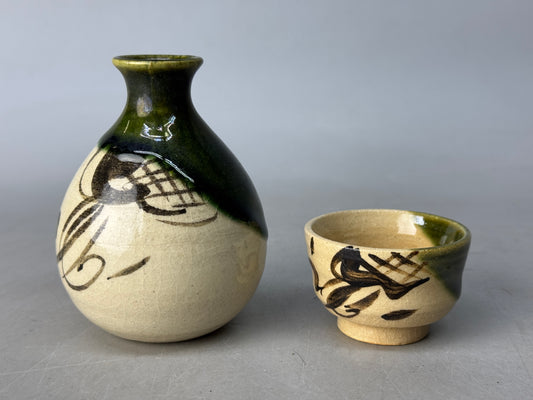 Y8671 CHOUSHI Oribe-ware Sake bottle cup set signed box Japan antique tableware