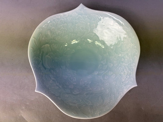 Y8799 CHAWAN Celadon bowl Flower Bird Rabbit signed box Japan antique pottery