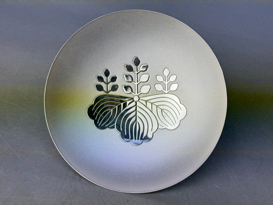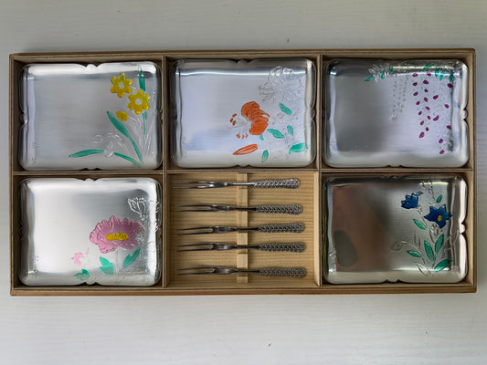 Y9213 DISH Serving plate floral pattern metal fork signed box Japan antique