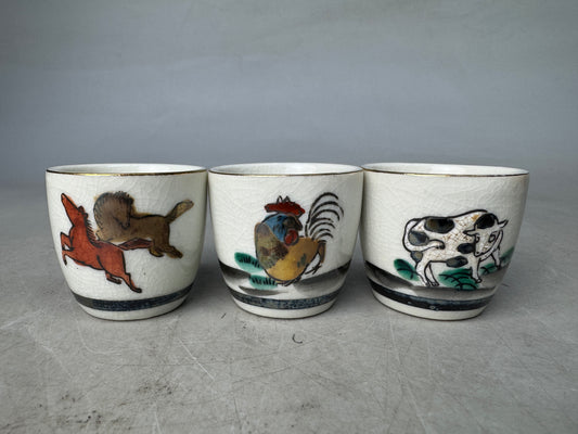 Y8880 CHAWAN Kutani-ware 12 Sake cup set zodiac signs signed box Japan antique