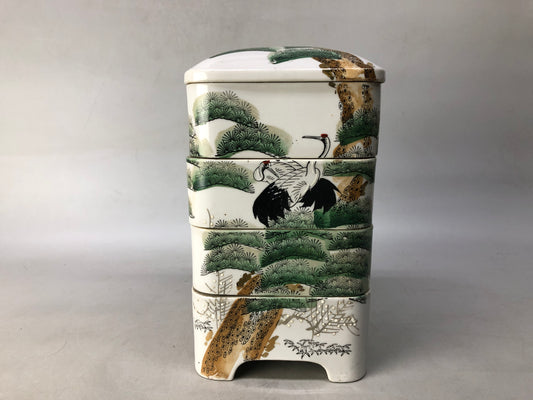 Y8386 BOX Seto-ware 4-tiered container Crane Pine signed Japan antique storage