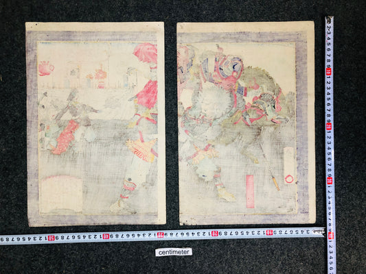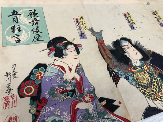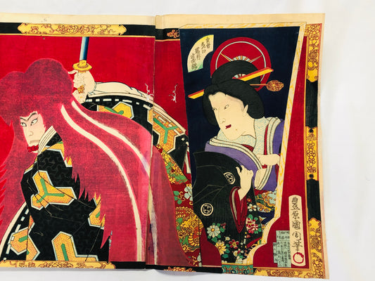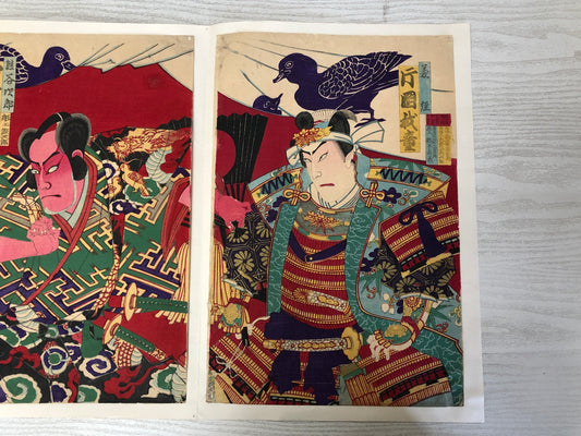 Y5506 WOODBLOCK PRINT Kunichika triptych set of 2 Kabuki Japan Ukiyoe antique