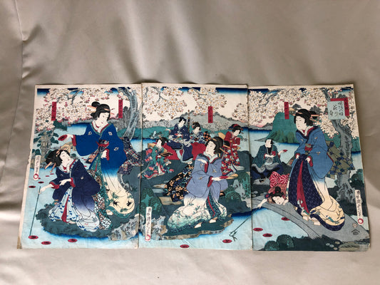 Y4188 WOODBLOCK PRINT Kunisada Cherry-blossom viewing triptych Japan Ukiyoe art