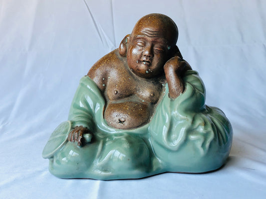 Y4533 STATUE Celadon Hotei sleeping God of Cleverness figure Japan antique decor