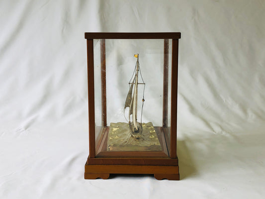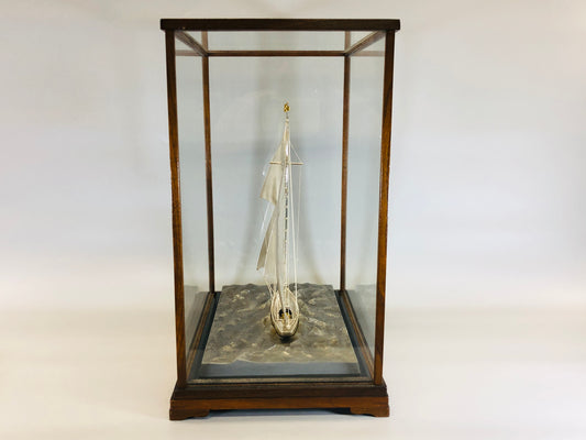 Y5416 OKIMONO Silver Yacht glass case Japan antique interior decor vintage