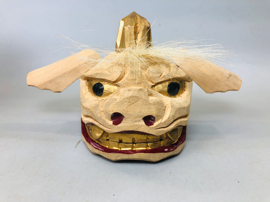 Y5884 OKIMONO Lion head figurine wood carving signed box Japan antique interior