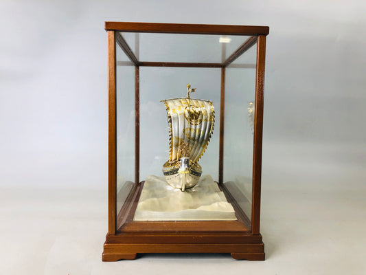 Y6014 OKIMONO Silver Yacht figure signed glass case Japan antique interior decor
