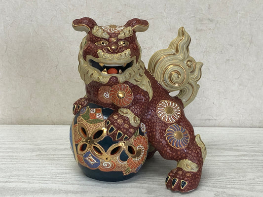 Y2908 OKIMONO kutani-ware Lion Ball signed Japan antique statue figure figurine