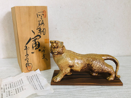 Y3619 OKIMONO Seto-ware Tiger figure signed box Japan antique interior decor