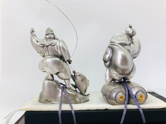 Y4413 STATUE Silver Ebisu Daikoku figure glass case Japan vintage antique decor