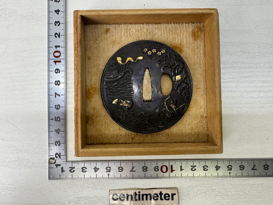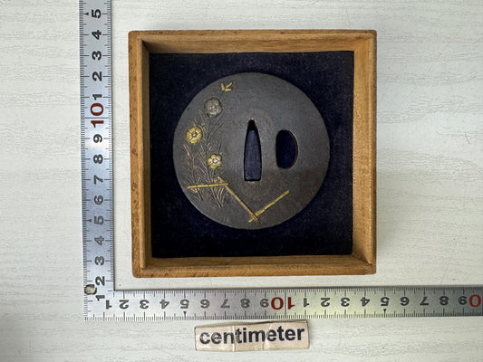 Y10199 TSUBA Iron sword guard brass inlay box Japan samurai antique koshirae edo