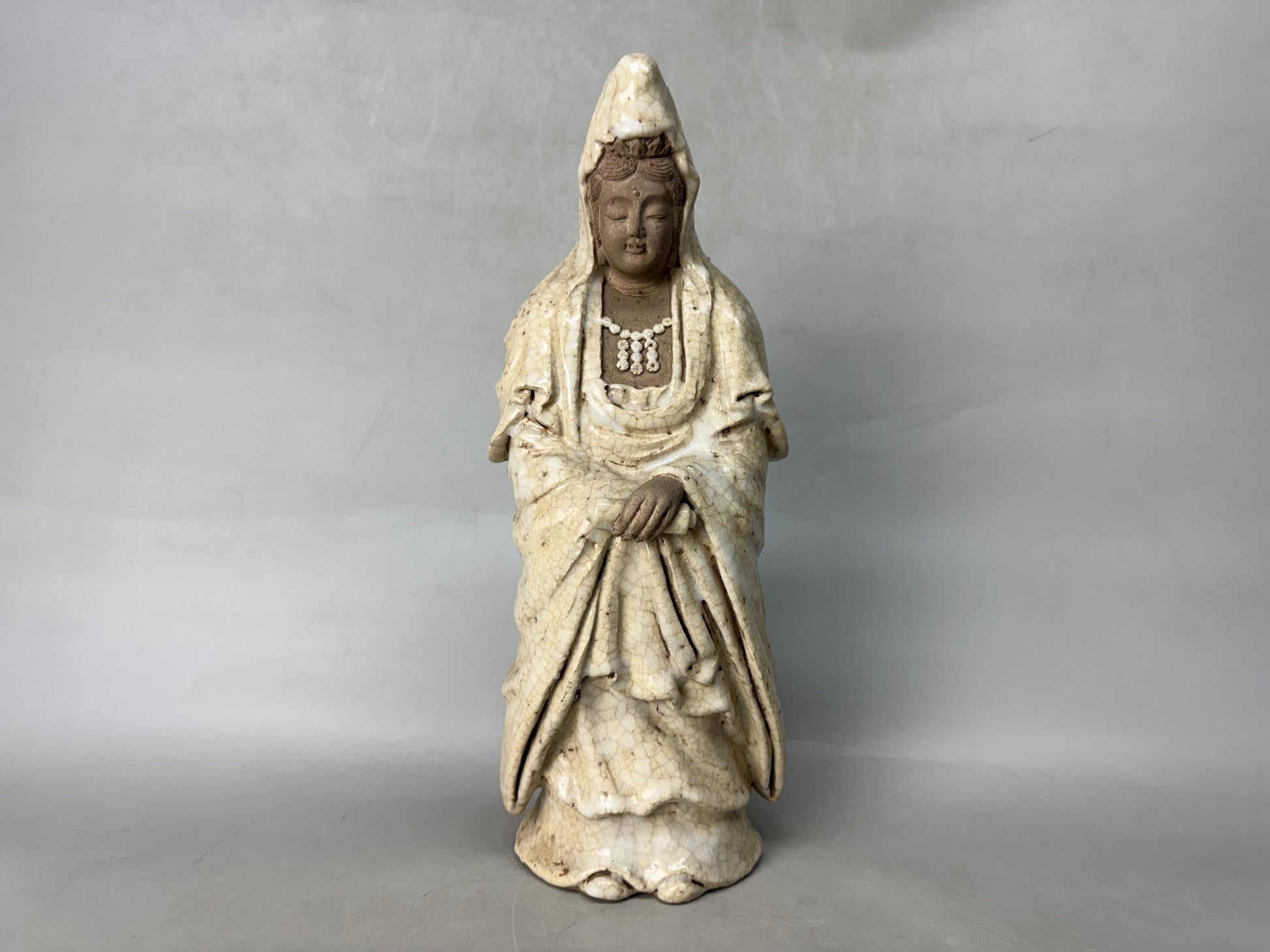 OKIMONO Mino-ware White-robed Kannon figurine signed