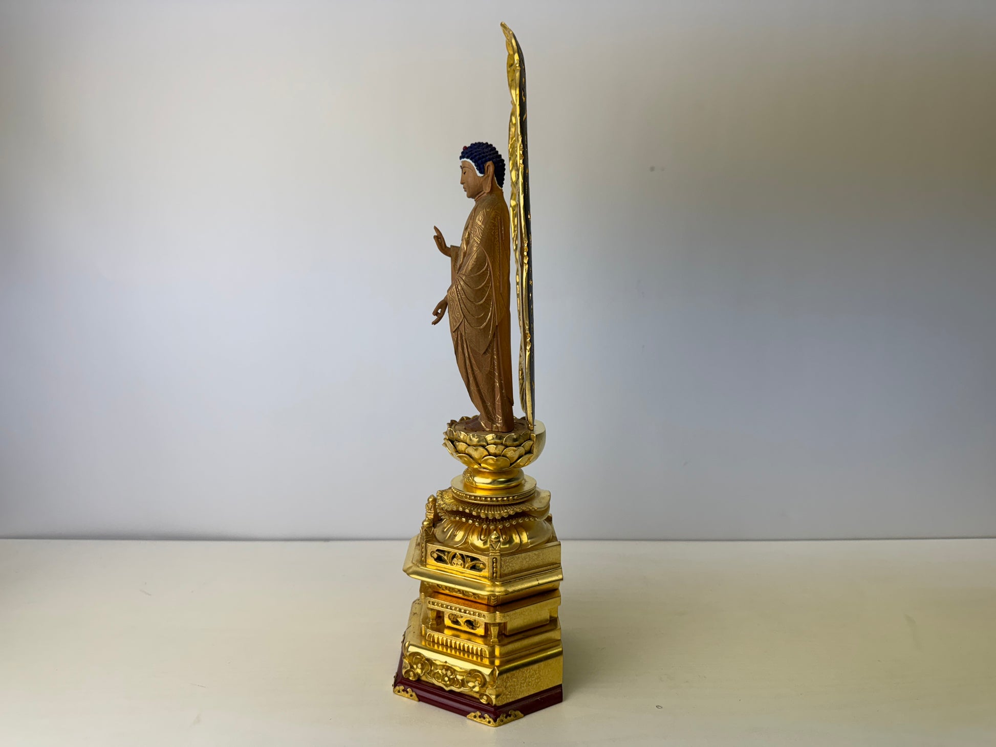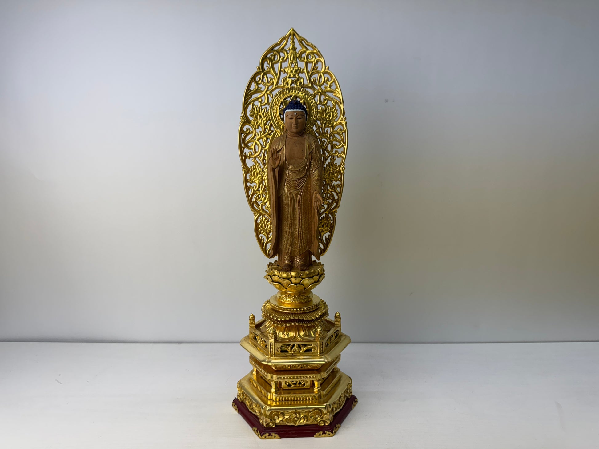 STATUE Buddha figurine plain wood gold leaf openwork Halo