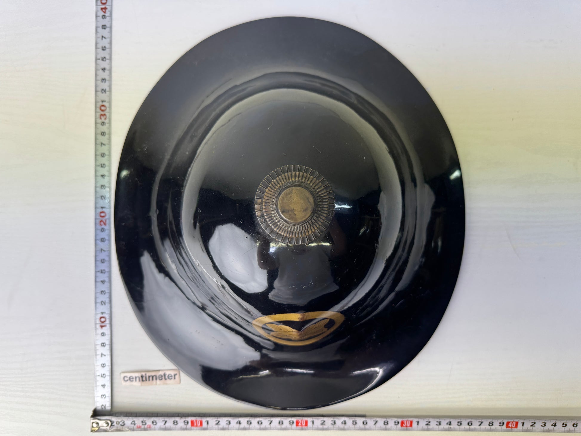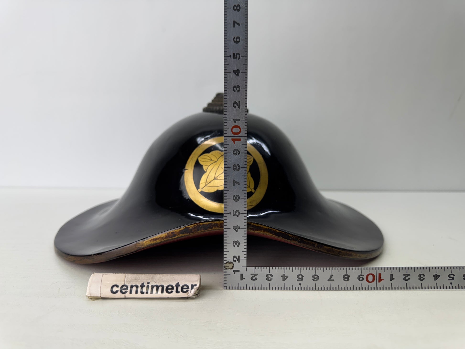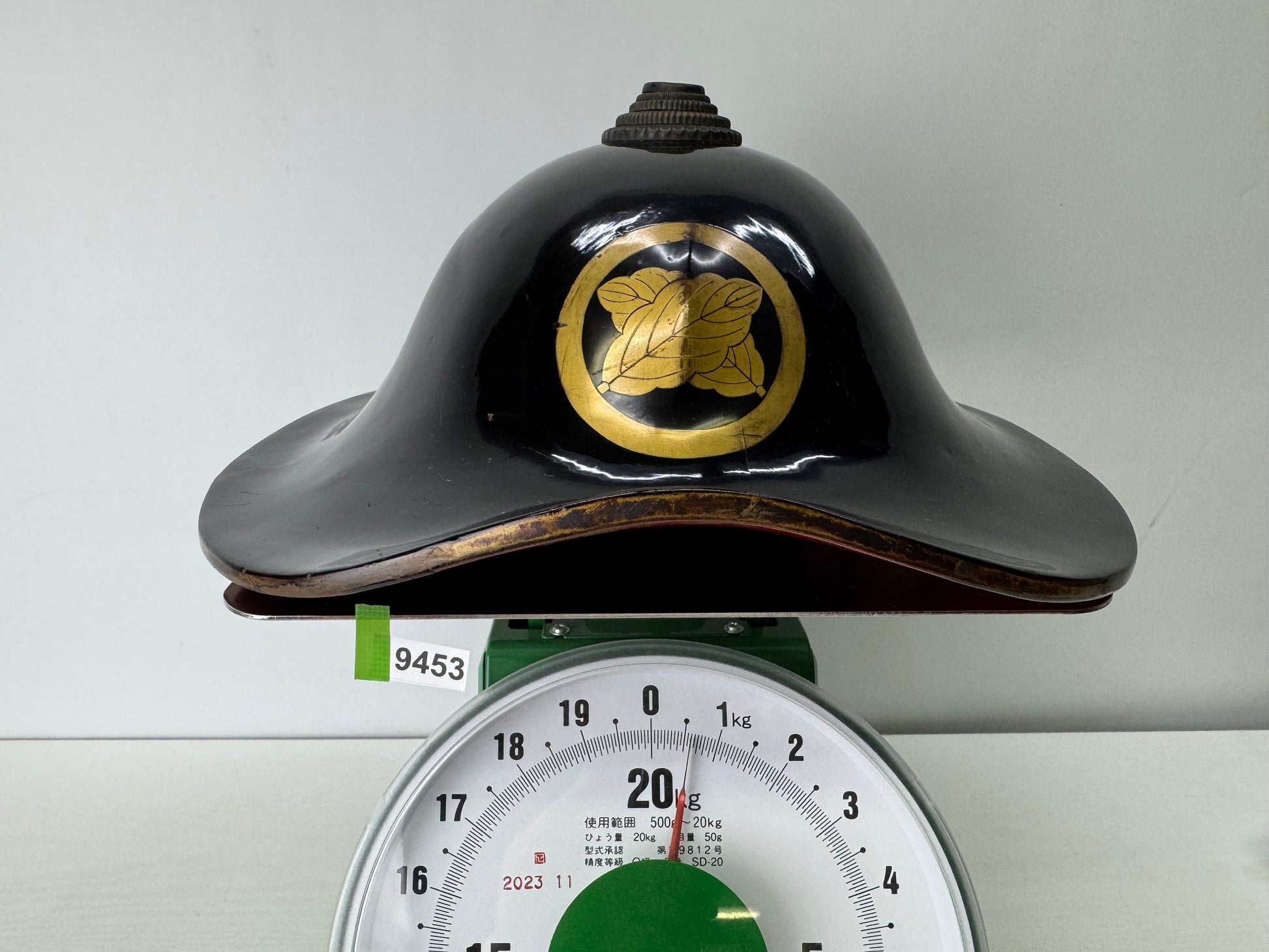 Y9453 JINGASA Black lacquer family crest Japan antique samurai hat yoroi helmet
